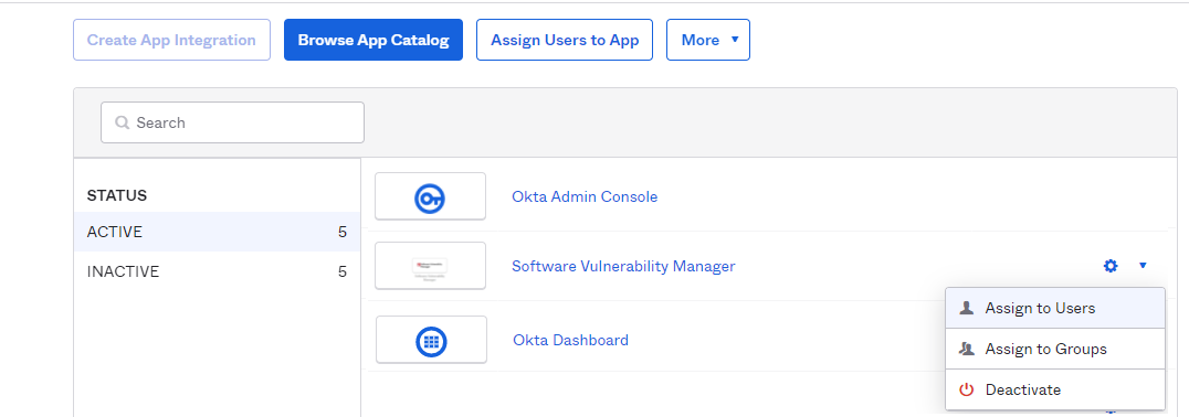 To assign Software Vulnerability Manager users to the Okta SSO app, click settings drop down, and choose Assign to Users. You can also assign user by clicking Assign Users to App tab.