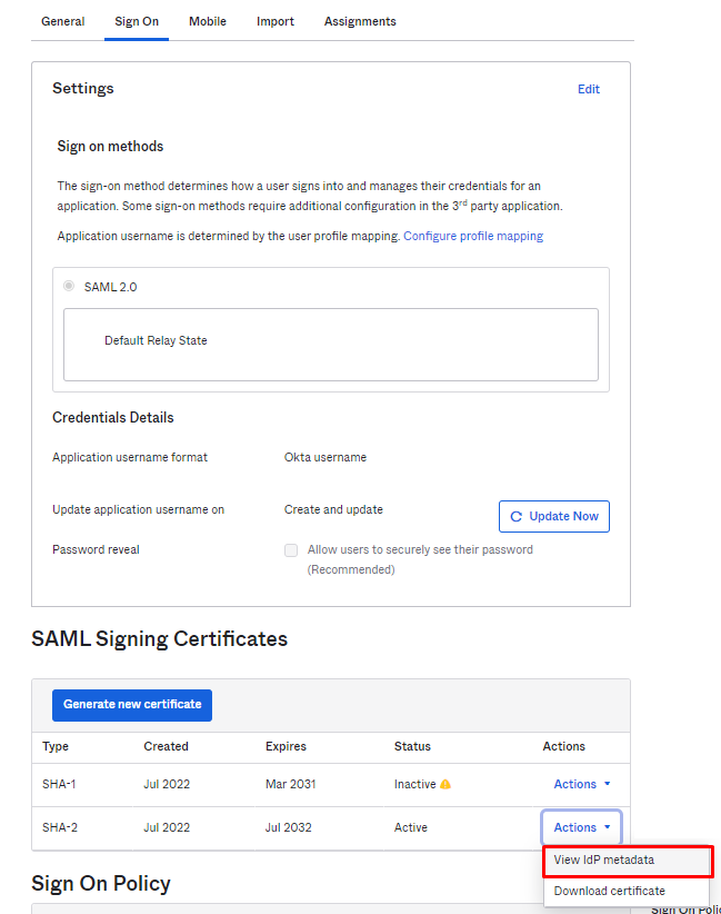 At the Okta SignOn, select SAML Signing Certificates > Actions drop down > View IdP metadata.