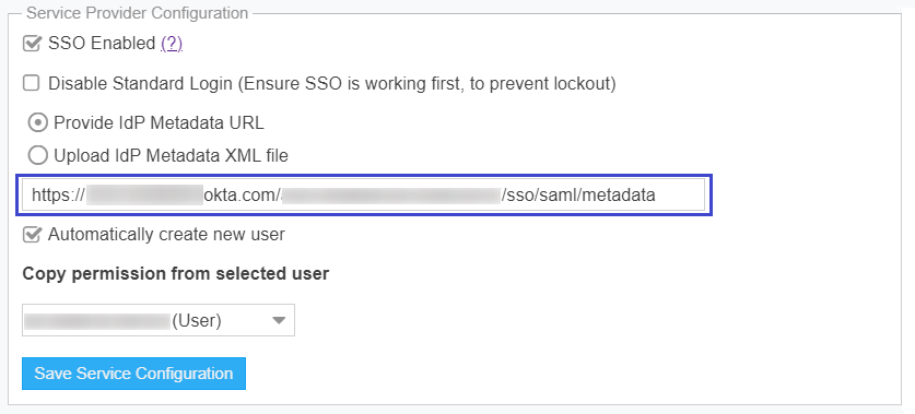 Copy the Identity Provider metadata URL from Okta, login into the partition admin, browse Configuration >Settings > Service Provider Configuration, and then check SSO Enabled. Select Provide IdP Metadata URL and paste the copied IdP metadata URL into the text box.