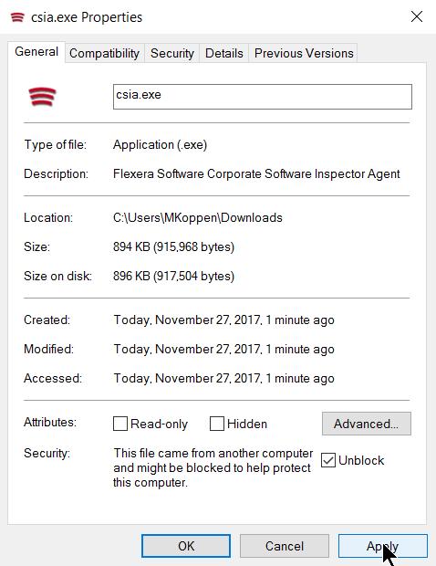 Make sure to right click on the.exe in the deployment share to “Unblock” it. Click Apply > OK.