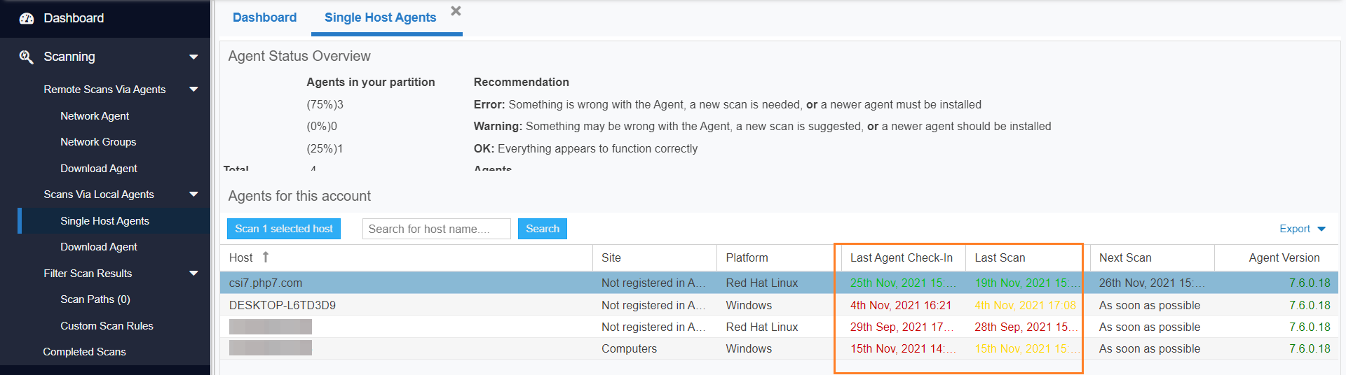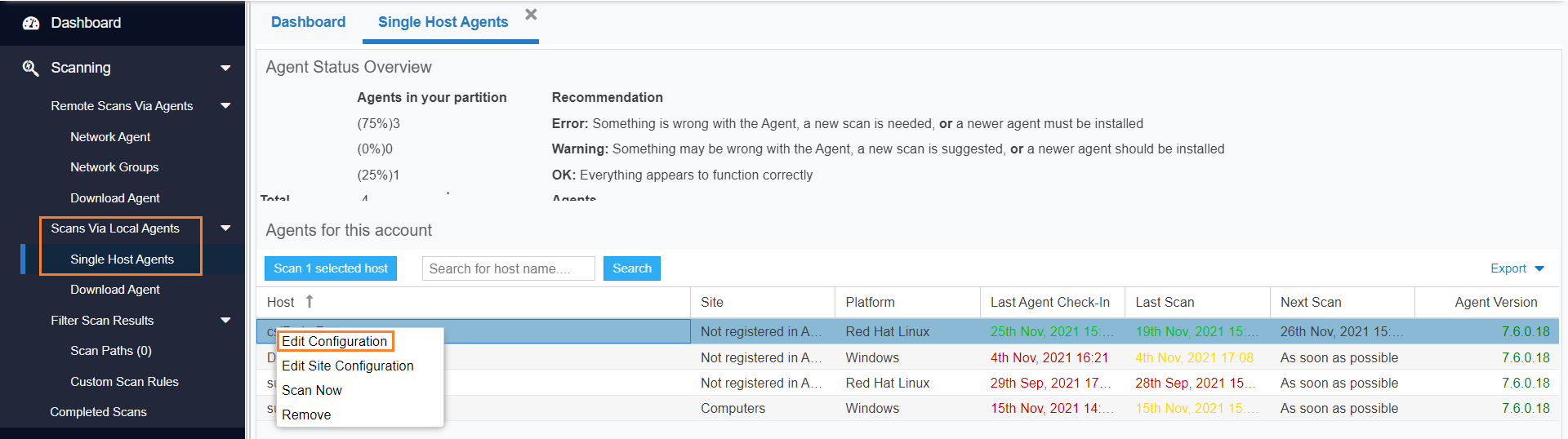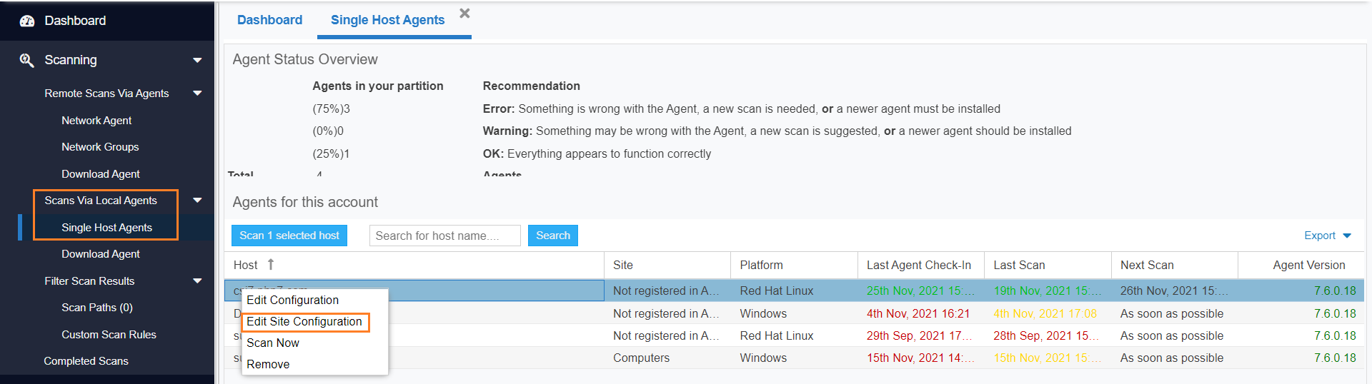 • A Site is linked to multiple hosts, Edit Site configuration reflects the setting changes in all the hosts in that Site. ![](/images/Scanning_Single Host Agents_Edit Site Configuration.PNG)